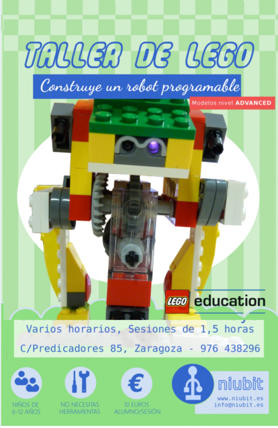 El taller tiene una duración de 1 hora y media, y se realiza los sábados en horario de mañana o tarde, a elegir. Puedes venir los sábados que quieras, en cada taller construiremos un prototipo de robot diferente, y plantearemos nuevos retos de construcción para que puedas seguir avanzando...