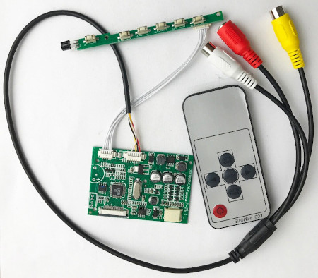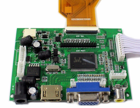 La segunda pantalla salió de un reproductor de DVD de coche para las plazas traseras con pantalla doble, que había quedado desparejada. En este caso la pantalla era de peor calidad y sólo admitía un controlador analógico, es decir que la entrada debía hacerse por video compuesto o RGB. La Raspberry tiene una salida de este tipo escondida en el conector jack de auriculares, así que también nos animamos a localizar un controlador para aprovechar la pantalla en algún proyecto. La pantalla tiene como designación AT070TN07 y tampoco fue difícil localizar un controlador en este caso por 12€: