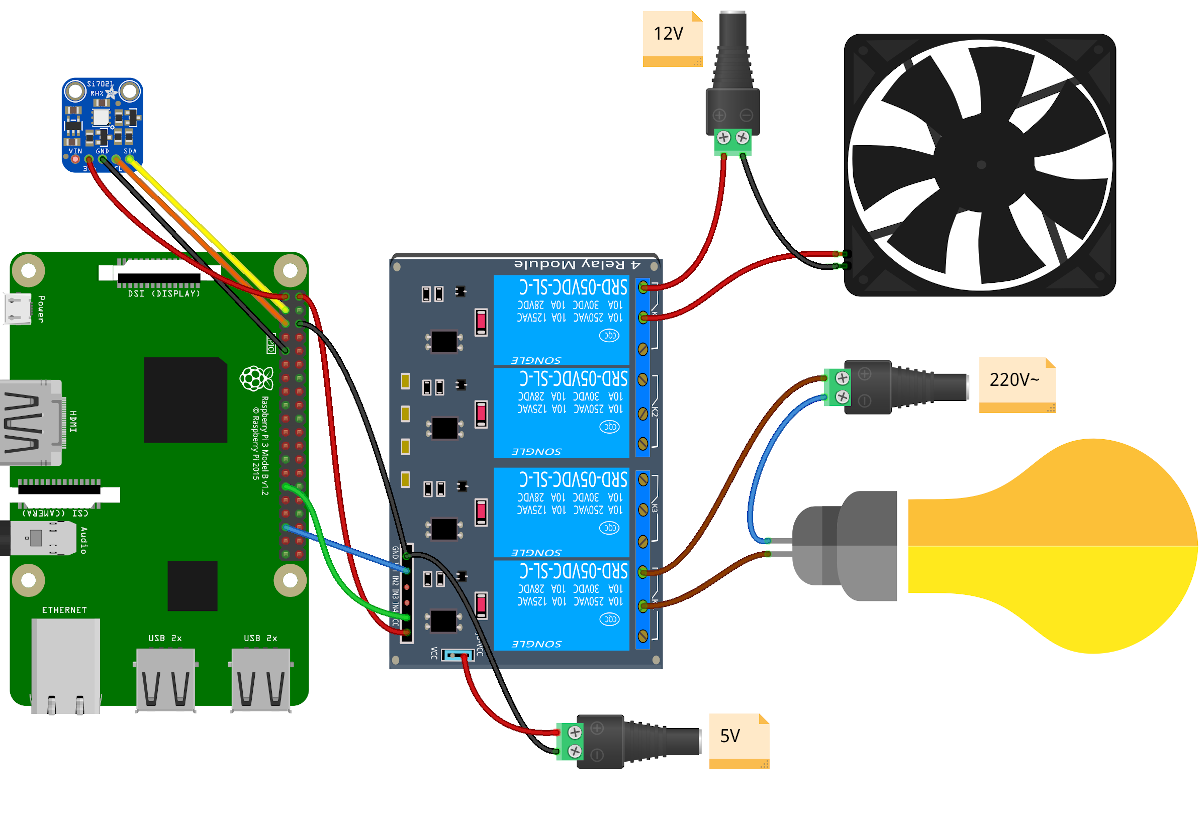 Aunque como se ve en el esquema necesitamos tres fuentes distintas de tensión, se utilizó una fuente de alimentación para disco duro de ordenador que en el mismo conector de salida nos da los 5V necesarios para Raspberry Pi y el módulo de relés, además de los 12V que se utilizan en los ventiladores. En el esquema sólo aparece el ventilador controlado por software. El otro ventilador que funciona continuamente para mover el aire del interior de la cámara, está conectado directamente a la fuente de 12V. La bomba de aire también está conectada directamente, esta vez a un enchufe de 220V. Simplemente le instalamos un interruptor para apagarla cuando resultara molesta por el ruido que hace.