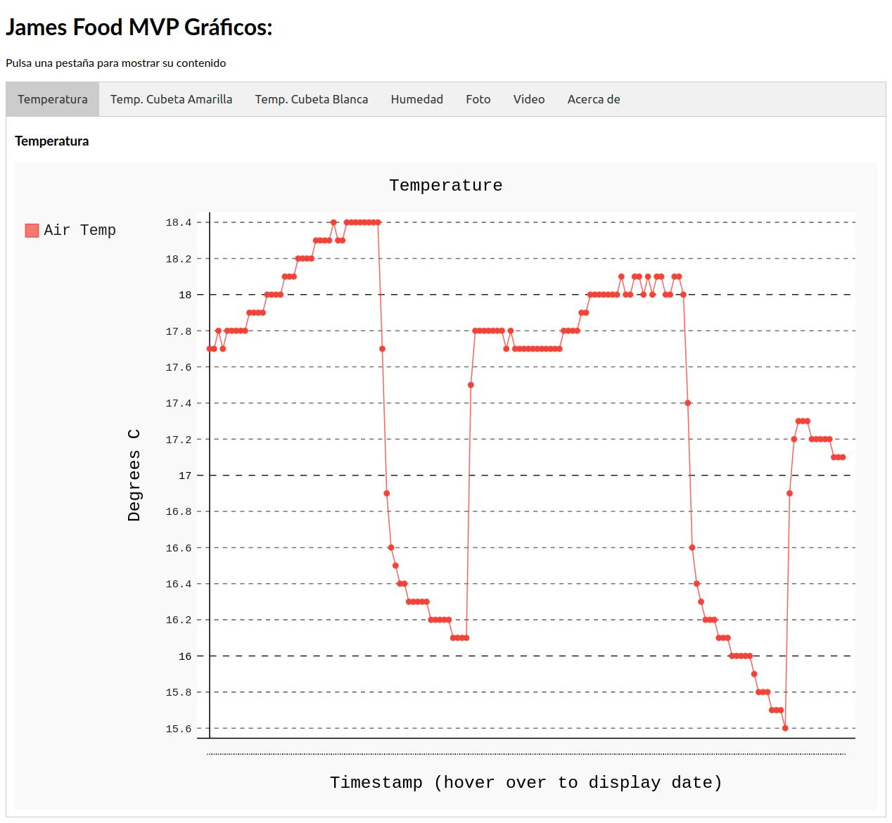 - Mide la temperatura y la humedad del aire cada 20 minutos y los almacena en una base de datos. En el modelo inicial (James Food), instalamos dos termómetros adicionales para registrar la temperatura del agua de las dos cubetas de cultivo.